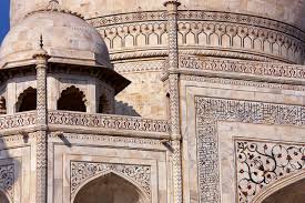 タージ・マハルの壁面には、イスラム教の聖典『コーラン』の一節が美しいカリグラフィー(書道)で刻まれています。この文字は、遠くから見たときにもバランスよく見えるよう、上部に行くほど文字が大きくなる工夫がされています。 -